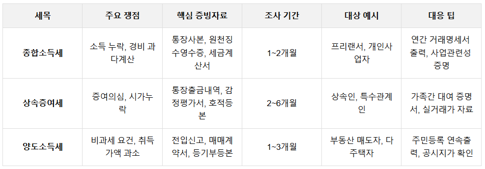 개인사업자의 경우 현금매출 누락, 가공 세금계산서를 이용한 가공경비, 사적경비의 비용처리, 세액감면 및 공제의 잘못된 적용, 인건비 등 과대계상 등이 주로 세무조사 적발사항이 됩니다. 국세청의 정보력이 나날이 높아지는 상황에서 탈세는 점점 어려워지고 있습니다. 정확하게 세금을 내는 것이 최고의 절세라는 새로운 인식이 필요한 시점입니다.